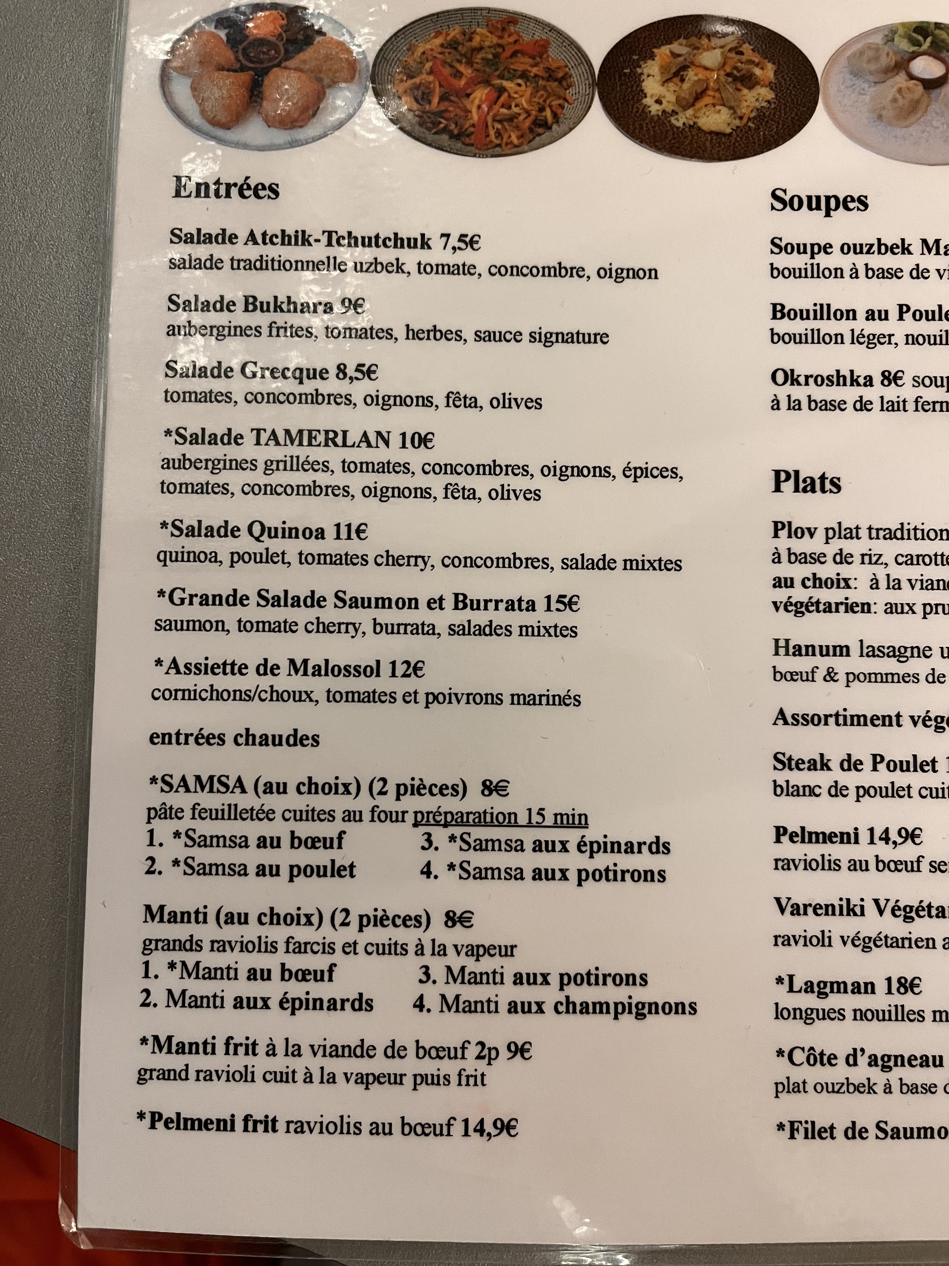 Bonjour! Je suis originaire d’Asie centrale et j’aimerais partager mon avis : La carte est plutôt complète : on y retrouve les plats phares. J’ai pris les « mantis » qui était juteuse et bien assaisonnée, Puis le plov qui n’étais franchement pas mauvais mais la viande manquait un peu de gras ce qui rendait le plat un peu plus fade. Évidemment ce ne sont pas les meilleurs plats ouzbek que vous pouvez manger : mais si vous souhaitez retrouver vos plats d’enfance, cela fait toujours plaisir. C’est totalement correct.