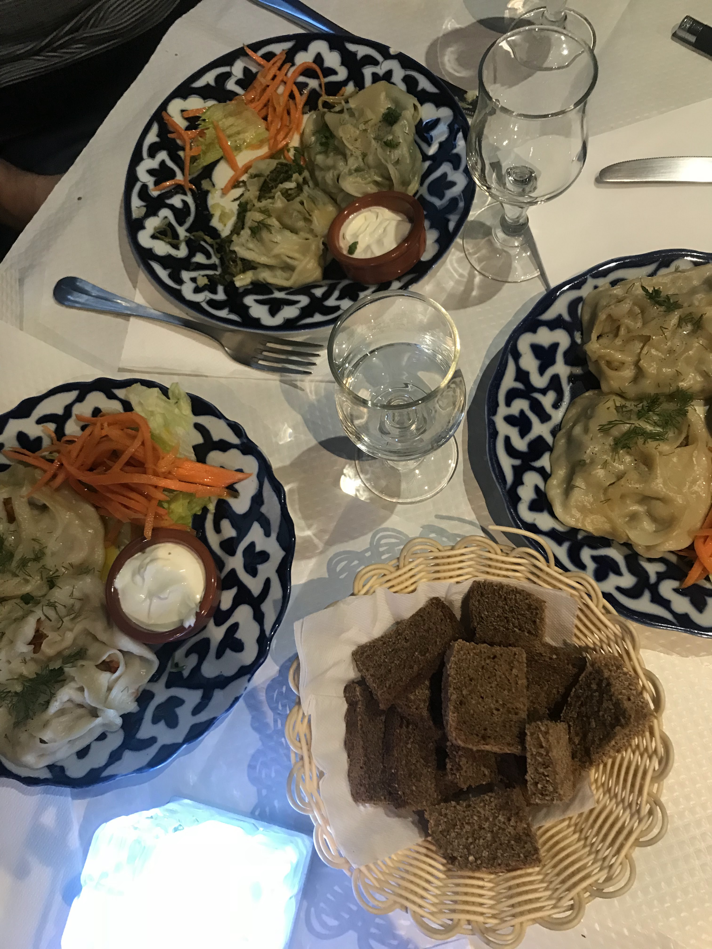 La nourriture était bien préparée et présentée, de bonnes portions solides servies dans une atmosphère conviviale et agréable. Rien à redire, juste pas très excitant : les saveurs n'étaient pas aussi épicées ou intéressantes que prévu. Le vin rouge géorgien accompagnait bien et les desserts ouzbeks étaient de très bonnes pâtisseries, avec beaucoup de miel.